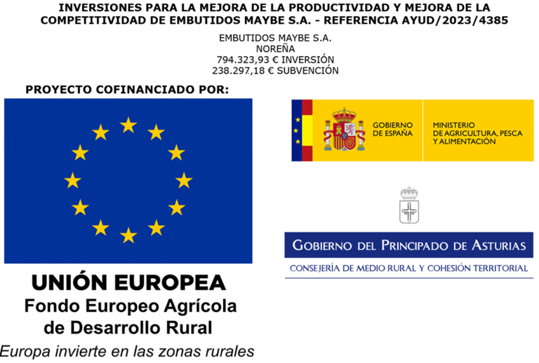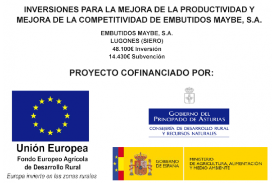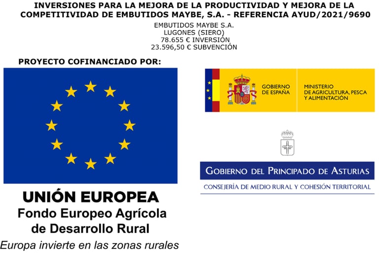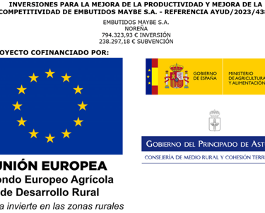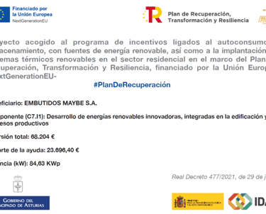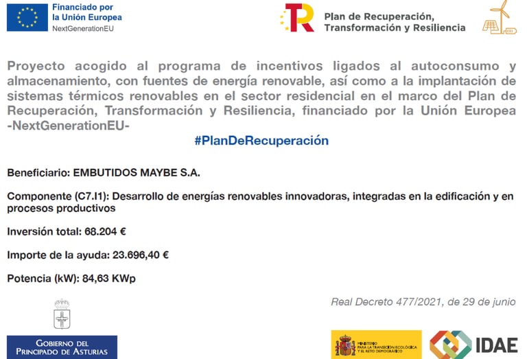 Embutidos Maybe, S.A. ha recibido una subvención de 23.696,40€ para la instalación de un sistema de autoconsumo fotovoltaico de 84,63 kWp, dentro del marco del Plan de Recuperación, Transformación y Resiliencia financiado por la Unión Europea - NextGenerationEU. Proyecto acogido al programa de incentivos ligados al autoconsumo y almacenamiento, con fuentes de energía renovable, así como a la implantación de sistemas térmicos renovables en el sector residencial en el marco del Plan de Recuperación, Transformación y Resiliencia, financiado por la Unión Europea NextGenerationEU #PlanDeRecuperación