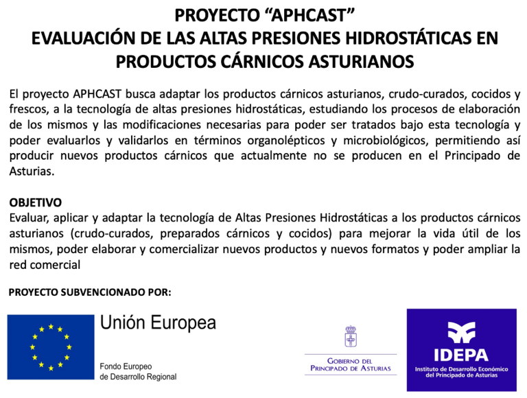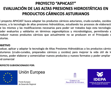 El proyecto APHCAST busca adaptar los productos cárnicos asturianos, crudo-curados, cocidos y frescos, a la tecnología de altas presiones hidrostáticas, estudiando los procesos de elaboración de los mismos y las modificaciones necesarias para poder ser tratados bajo esta tecnología y poder evaluarlos y validarlos en términos organolépticos y microbiológicos, permitiendo así producir nuevos productos cárnicos que actualmente no se producen en el Principado de Asturias.