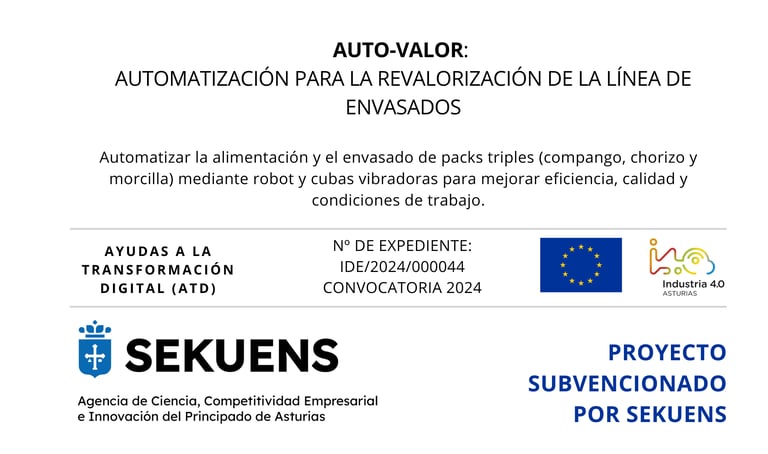 AUTOVALOR moderniza la termoformadora mediante un sistema robotizado de alimentación y posicionamiento de packs triples (compango, chorizo y morcilla) y cubas vibradoras, con el fin de mejorar la eficiencia operativa, la calidad del producto y la seguridad alimentaria, liberando al personal de tareas repetitivas para centrarse en intralogística, inventariado, calidad y limpieza.